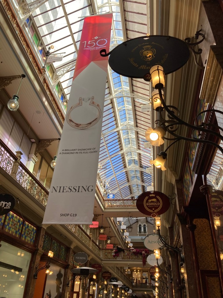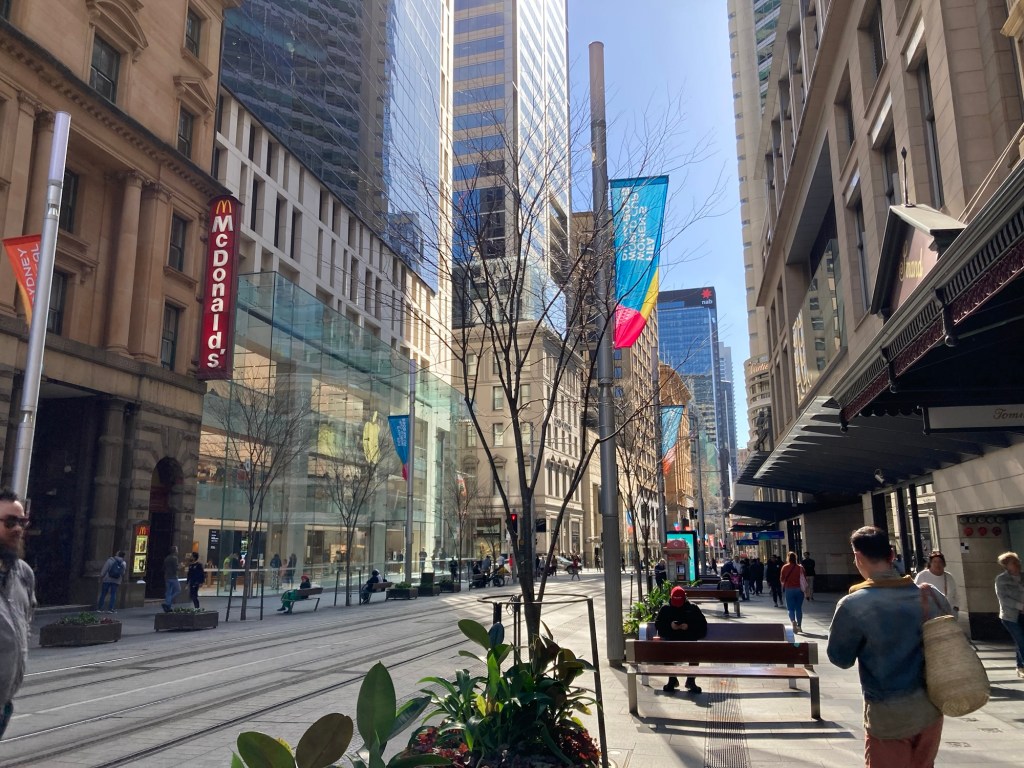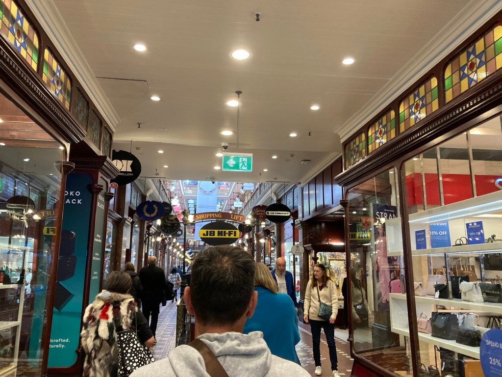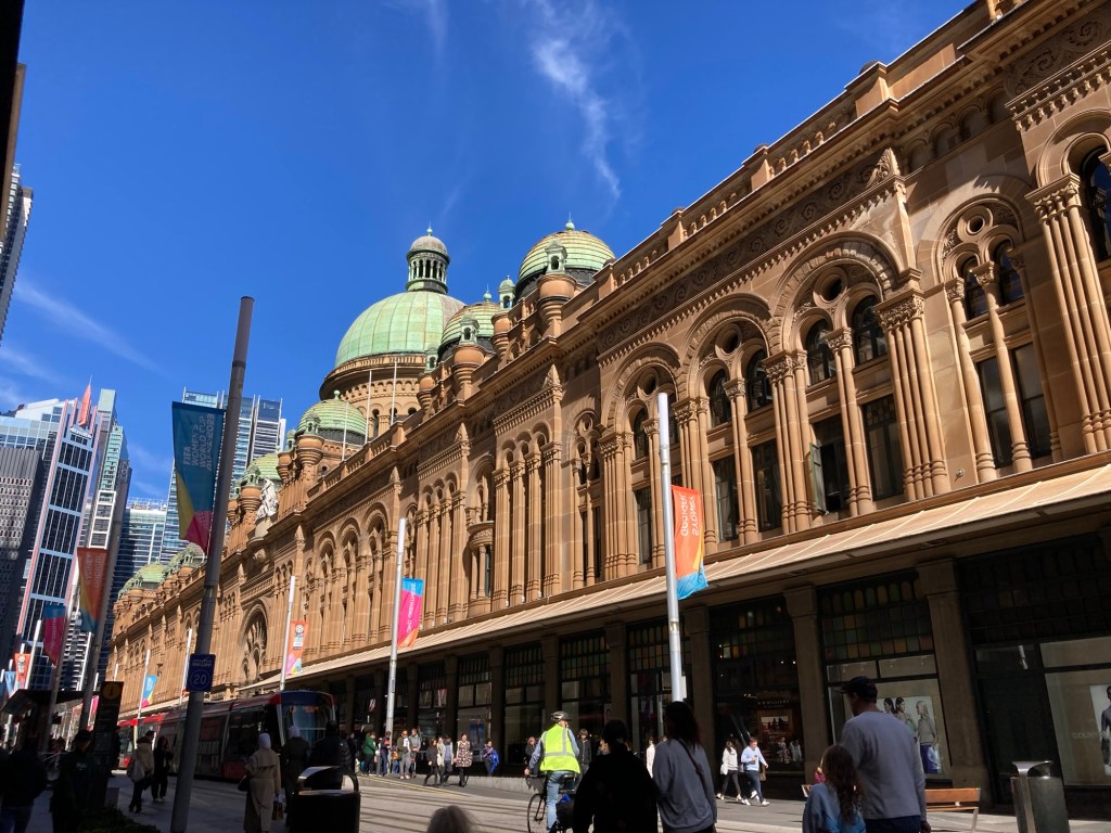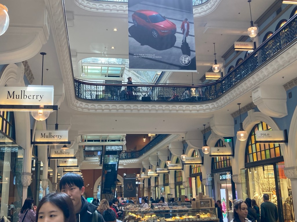 Começamos o dia pela região central, explorando a área entre o Sydney Arcade, o Queen Victoria Building e o Shopping Westfield. Essa parte da cidade é um verdadeiro paraíso para quem gosta de arquitetura e compras: as fachadas históricas se misturam com galerias modernas e vitrines cheias de design australiano.