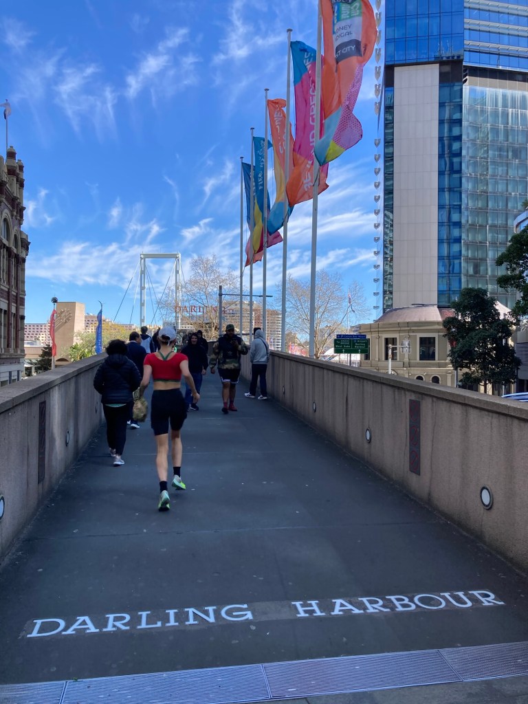 De lá, seguimos para a região de Darling Harbour, uma das áreas mais agradáveis para passear à beira d’água. O bairro é cheio de vida: crianças brincando nas fontes, turistas atravessando as pontes de pedestres e barcos deslizando lentamente pelo porto.