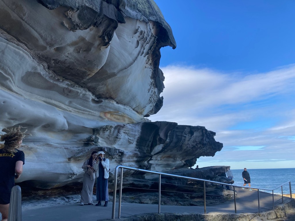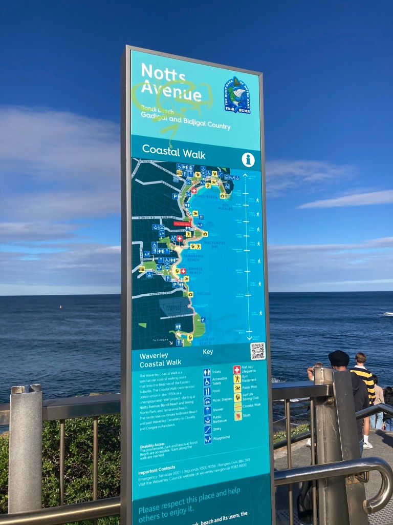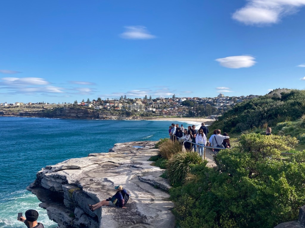 Antes de ir embora, caminhamos pela Bondi to Waverly Coastal Walk, uma trilha costeira de cerca de 6 km que serpenteia os penhascos e praias menores da região. Mesmo que você percorra apenas o trecho inicial, o visual compensa: paredões rochosos, enseadas escondidas e o mar infinito à frente. É um dos passeios mais bonitos de Sydney e uma forma perfeita de encerrar o dia.