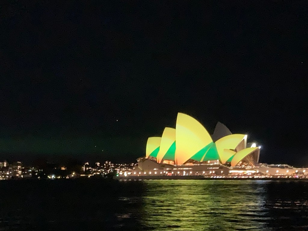Voltamos à Opera House à noite, incapazes de resistir ao seu encanto. Desta vez, ela brilhava em verde e amarelo, homenageando a seleção feminina da Austrália na Copa do Mundo. As luzes dançavam sobre a água, e Sydney parecia respirar orgulho e alegria.