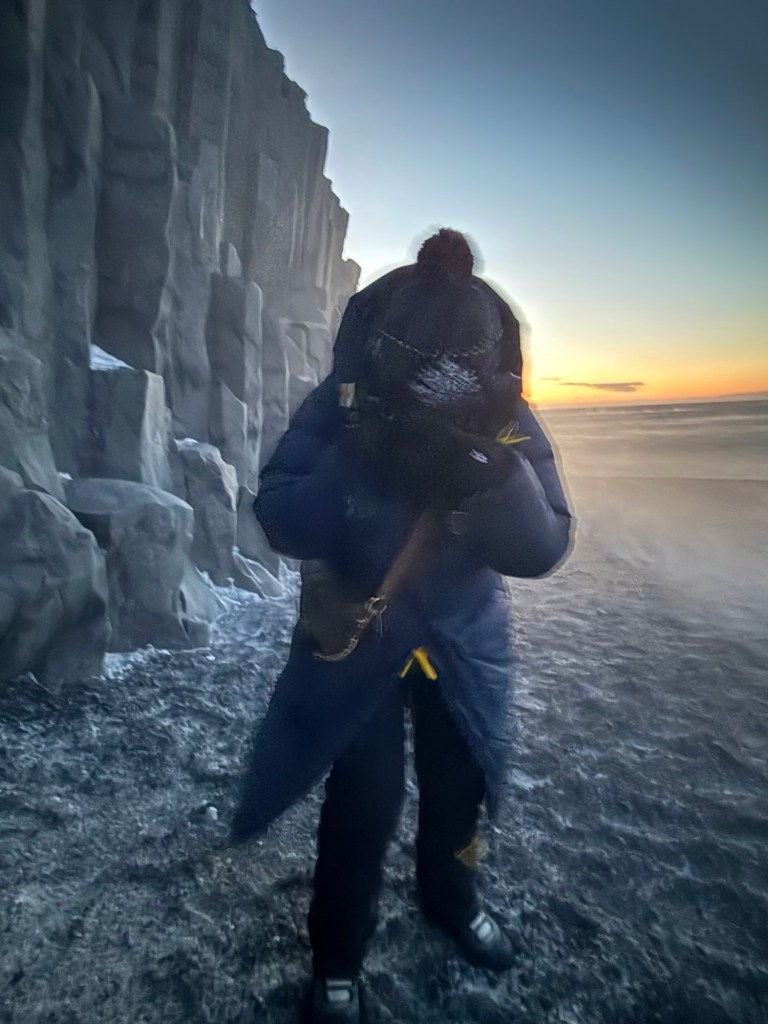 A primeira parada foi na Reynisfjara Black Sand Beach é um daqueles lugares que impõem respeito imediato. A areia negra, formada por lava vulcânica moída ao longo de séculos, absorve a luz e cria um contraste absoluto com o branco da neve e o cinza do céu islandês.