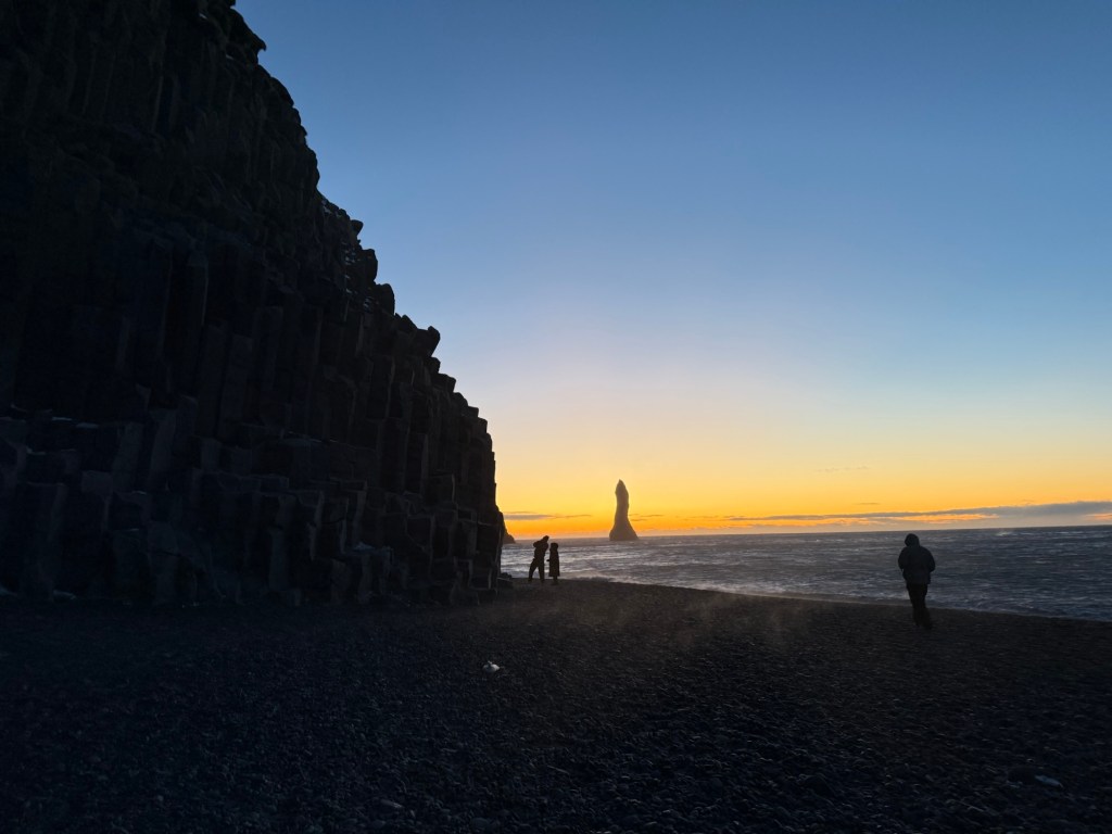Ao fundo, os rochedos de Reynisdrangar emergem do mar como sentinelas, reforçando o clima dramático do lugar. É uma praia que não convida ao descanso, mas à contemplação — um lembrete poderoso da origem vulcânica da Islândia e da força constante que molda sua paisagem.