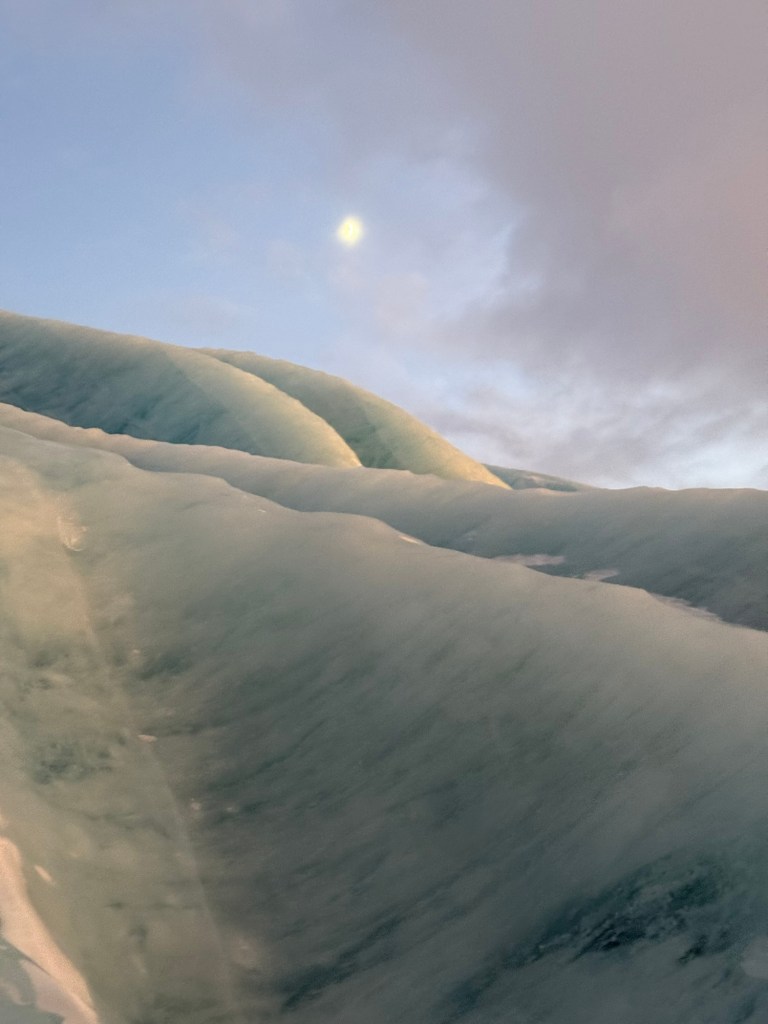 O gelo não é branco como imaginamos: ele varia entre tons de azul profundo, cinza e quase transparente. Esse azul intenso existe porque o gelo antigo é tão comprimido que absorve quase todas as cores da luz, refletindo apenas o azul — um detalhe simples, mas impressionante quando visto de perto.