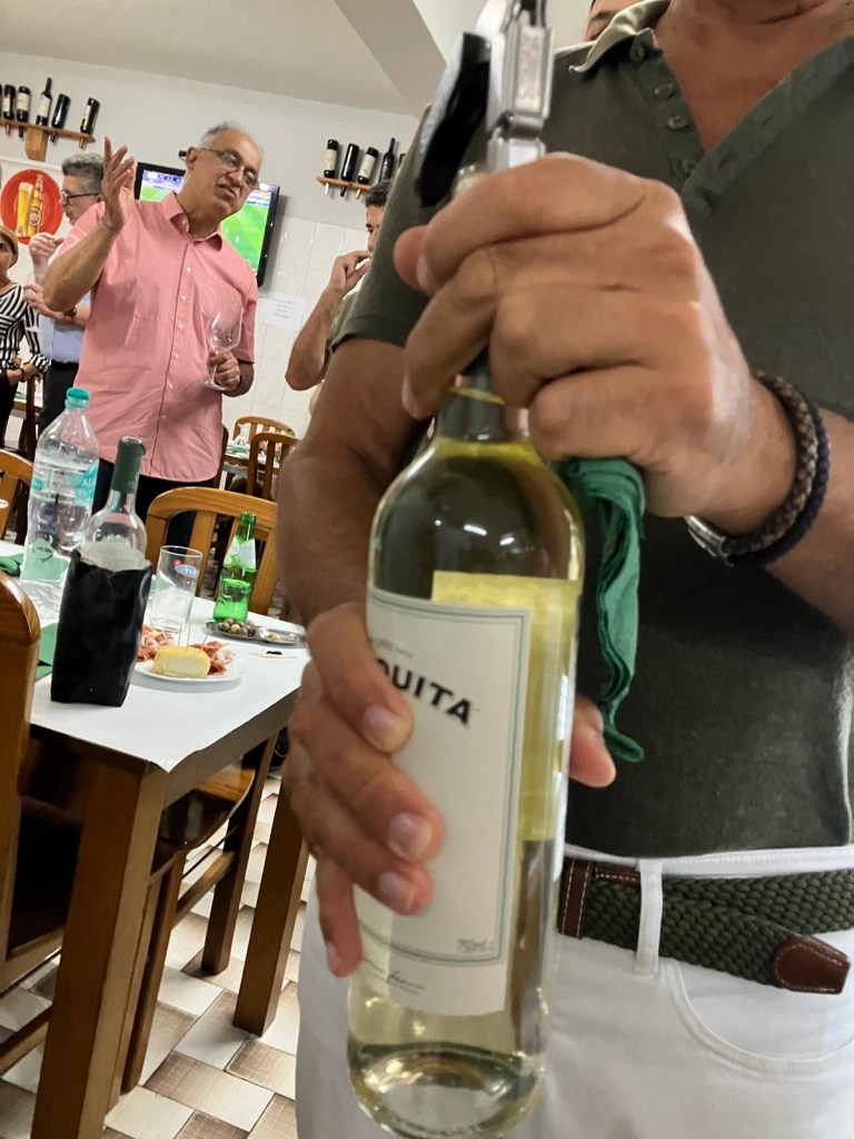 Na margem sul, em Palmela, o jantar aconteceu em uma tasca local, daquelas onde nada é encenado: mesas simples, cadeiras de madeira, vinho branco servido sem cerimônia, pão na mesa e conversas que misturam trabalho e vida. Tenho que confessar que me senti em casa, todos os pratos eram muito familiares e até serviram o vinho favorito do meu avô: o Periquita, que ele mandava trazer de Portugal.
