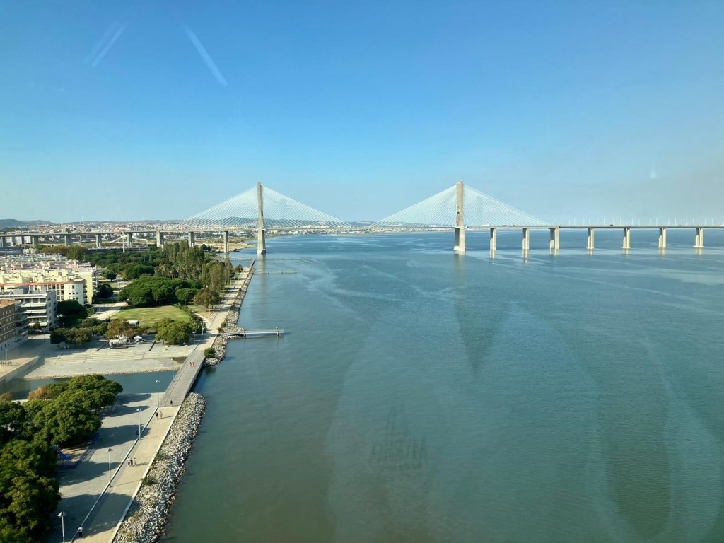 Caminhar pelo calçadão à beira do Tejo é uma das grandes atrações: vistas amplas, ciclovias, cafés modernos e uma atmosfera leve, muito diferente do centro histórico. Ao fundo, a Ponte Vasco da Gama — uma das pontes mais longas da Europa — reforça a sensação de espaço e modernidade.
