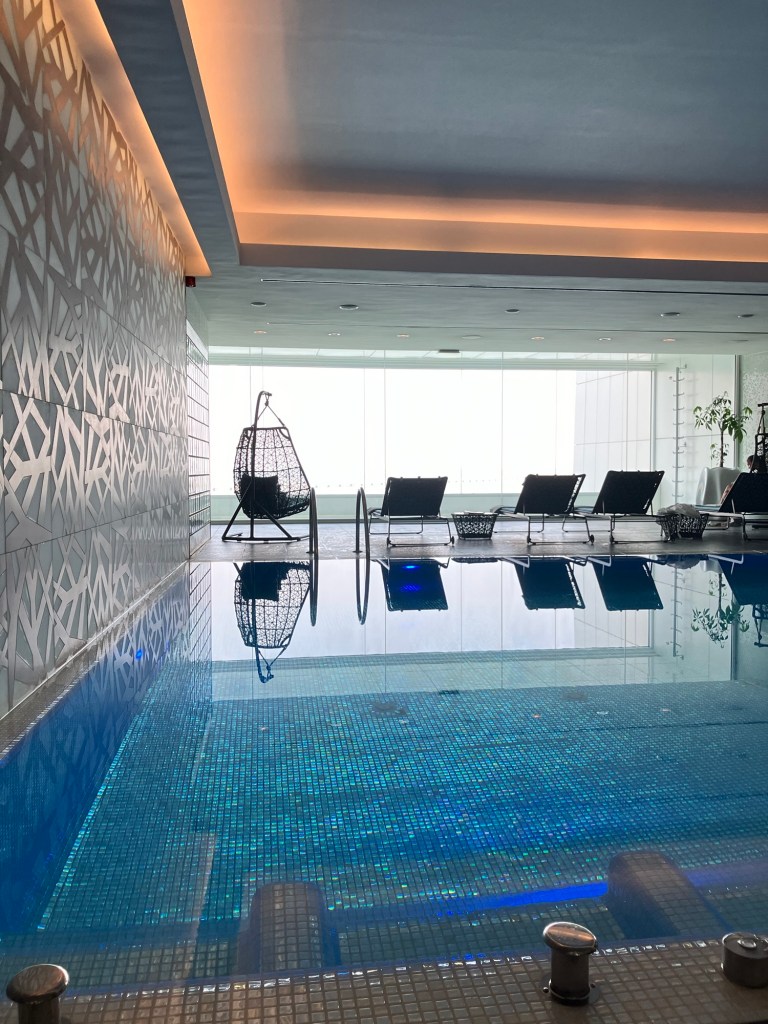 O spa do hotel segue a mesma lógica de silêncio e sofisticação: ambiente minimalista, vista aberta para o rio e uma sensação constante de leveza. É um espaço pensado para desacelerar depois de dias intensos de reuniões, perfeito para quem viaja a trabalho mas não abre mão de conforto.