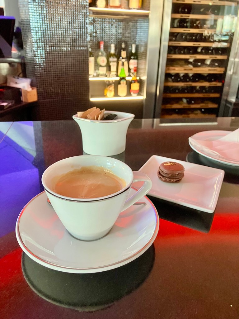 No café da tarde, além da variedade impecável, um detalhe chama atenção: macarons finalizados com folha de ouro, um gesto discreto, mas simbólico, que reflete o cuidado estético e o posicionamento premium do hotel.